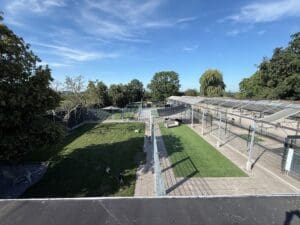 Bij regen kunnen de honden droog verblijven onder de overkapping op het betonnen gedeelte. Na het buitenspelen krijgen ze hun maaltijd (tweemaal daags), waarna ze lekker kunnen uitrusten in hun eigen verblijf.